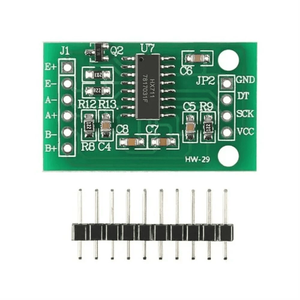 The HX711 is a precision 24-bit analog-to-digital converter (ADC) designed for weigh scales and industrial control applications. This module interfaces directly with load cells and strain gauges, providing accurate weight measurements with resolutions up to 1 in 16,777,216.