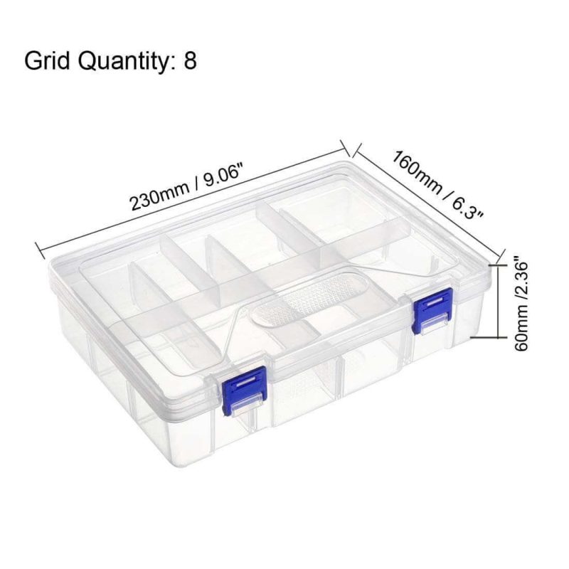 10 grids clear hard plastic box organizer, simple and practical. Used to put all your small items in one place without losing them. It’s clear so you can easily see which items are stored in each organizer. Made with Non-toxic Plastic, which is very sturdy and when you close the container and snap it, if you drop it, no worries, dividers are tight